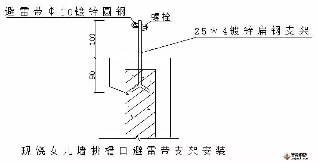 ⑴現(xiàn)澆女兒墻挑檐避雷帶支架安裝做法如下圖,扁鋼支架在安裝時(shí)要密切和土建專業(yè)配合好,對(duì)成排的避雷帶支架的水平度、垂直度要拉線逐個(gè)檢查。