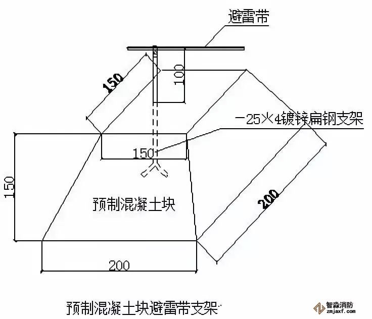 ⑸ 屋頂避雷帶支架在預(yù)制混凝土塊上安裝做法: