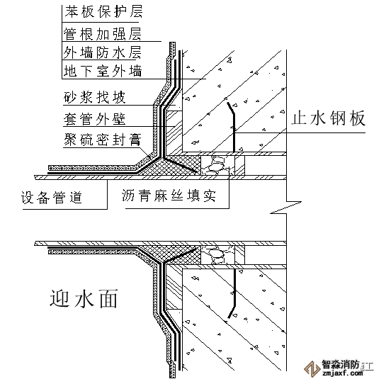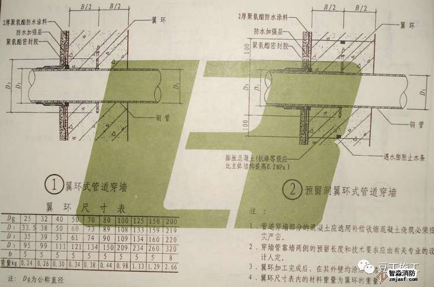 ③穿墻管止水環(huán)與主管或翼環(huán)與套管應(yīng)連續(xù)滿(mǎn)焊,并作防腐處理。