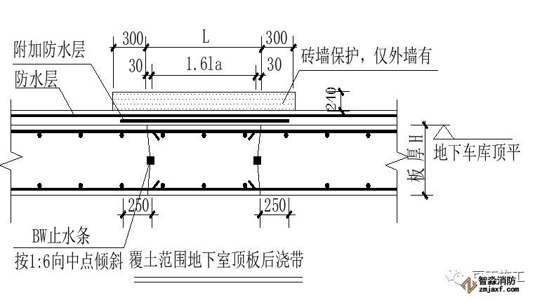 工藝說(shuō)明:地下室頂板后澆帶在做防水施工前,內(nèi)側(cè)的卷材保護(hù)層先施工。鋪貼頂板卷材時(shí),先在頂板外側(cè)鋪一層防水加強(qiáng)層,然后大面卷材直接鋪過(guò)與之蓋板。綁扎墻體鋼筋時(shí),用附加筋將BW止水條固定墻體中間。