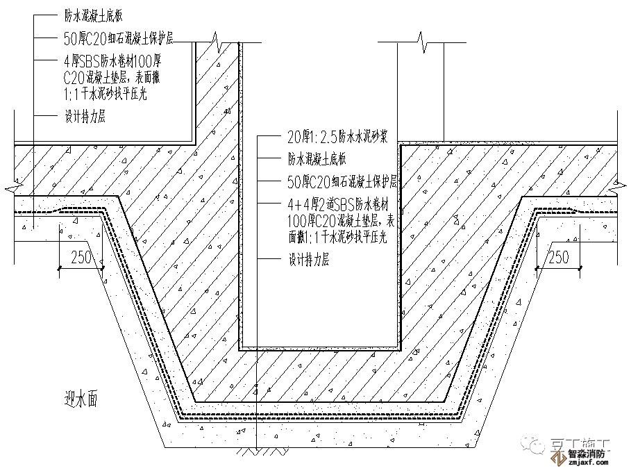 電梯井坑、集水坑內(nèi)墻面防水做法:a、基層;b、20厚1:2.5水泥砂漿找平壓光;c、1.2厚JS防水涂膜防水;d、20厚1:2.5水泥砂漿找平壓光。