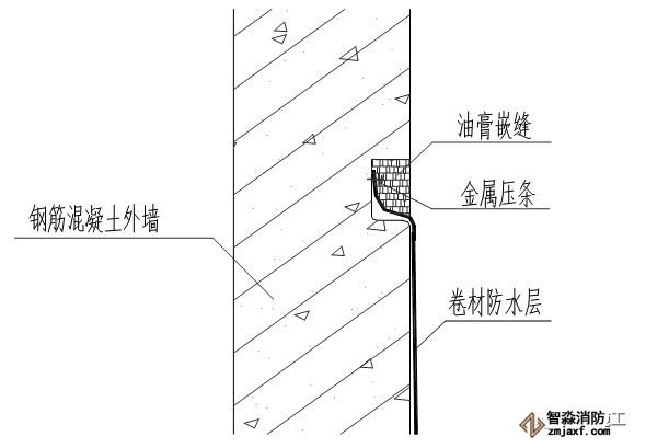 防水收口位置設(shè)置在距室外散水下150mm處,澆筑墻體混凝土?xí)r應(yīng)預(yù)留凹槽,防水末端先用3㎜×25㎜,金屬壓條鋼釘固定(間距500㎜再用密封膏封閉。