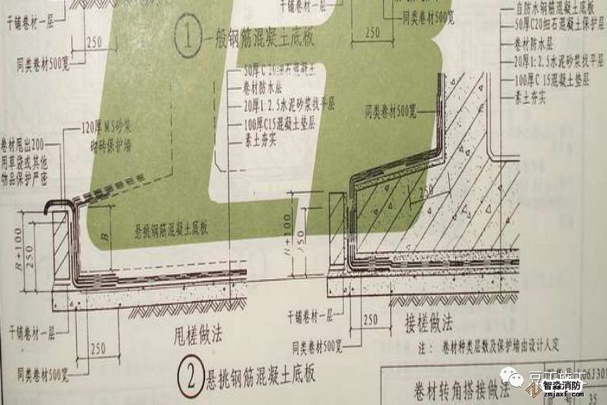 ④側(cè)墻卷采防水層的保護(hù)層與防水層應(yīng)粘接牢固,結(jié)合緊密,厚度均勻一致。在立面與平面的轉(zhuǎn)角處,卷材的接縫應(yīng)留在平面上,距立面不應(yīng)小于600mm;陰陽(yáng)角處找平層應(yīng)做成圓弧或45°(135 °)角,并應(yīng)增加1層相同的卷材,寬度不宜小于500mm。點(diǎn)擊>>工程資料免費(fèi)下載