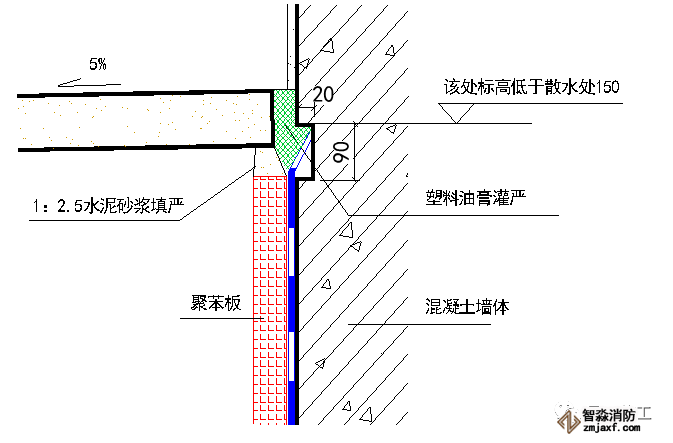 防水收口位置設(shè)置在距室外散水下150mm處,澆筑墻體混凝土?xí)r應(yīng)預(yù)留凹槽,防水卷材施工時(shí),將防水卷材端部壓在凹槽中,待室外散水施工完再用密封膏將凹槽及散水與外墻縫隙灌嚴(yán)。