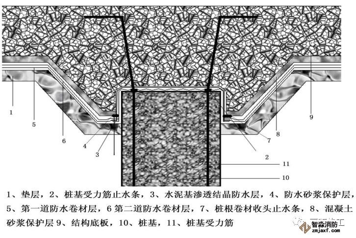 在樁頭、樁側(cè)及樁側(cè)外圍200mm范圍內(nèi)墊層的表面涂刷水泥基滲透結(jié)晶型防水涂料,在樁頭根部及樁頭鋼筋根部凹槽內(nèi)埋設(shè)遇水膨脹橡膠條,在樁頂、樁側(cè)及樁側(cè)外圍300mm范圍內(nèi)墊層上表面5mm厚聚合水泥防水砂漿。待基層達(dá)到卷材施工條件時(shí)進(jìn)行大面積防水卷材施工,卷材施工完畢后在樁側(cè)與卷材接縫處嵌聚硫嵌縫膏。