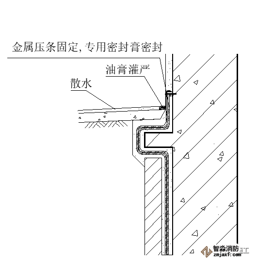 防水收口位置設(shè)置在距室外散水150mm處,末端先用3mmX25mm金屬壓條鋼釘固定(間距200mm),用鋼釘固定后再用密封膠將上口密封。散水與外墻之間預(yù)留30mm寬的縫隙,采用嵌縫油膏灌嚴(yán)。