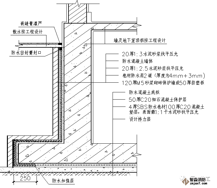 室外地下室頂板防水做法:a、現(xiàn)澆砼板b、20厚1:3水泥砂漿找平壓光;c、兩道4mm厚-20度SBS防水卷材(滿(mǎn)鋪);d、無(wú)紡布隔離層一道;e、80厚C20砼保護(hù)層找平壓實(shí)。