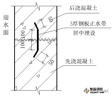 2、鋼板的凹面應(yīng)朝向迎水面,轉(zhuǎn)角處止水鋼板應(yīng)做成45°角。止水鋼板居中布置。橡膠止水帶及鋼板橡膠止水帶做法同上。