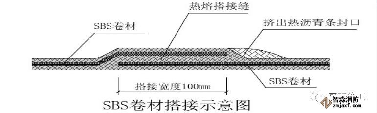 ③卷材防水層的搭接縫寬度,短邊150mm、長(zhǎng)邊100mm,允許誤差-10mm,搭接縫應(yīng)粘接牢固,密封嚴(yán)密,不得有皺折,翹邊、鼓泡等缺陷。