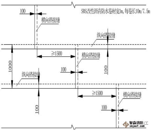 同一層相鄰兩幅卷材的橫向接縫,應(yīng)彼此錯(cuò)開(kāi)1500mm以上,避免接縫部位集中。上下層及相鄰兩幅卷材要錯(cuò)開(kāi),防水卷材的短邊和長(zhǎng)邊(橫縫和縱縫),其搭接寬度均不應(yīng)小于100mm。立面與平面的轉(zhuǎn)角處、卷材的接縫應(yīng)留在結(jié)構(gòu)板的平面上,距離立面應(yīng)不小于600mm。