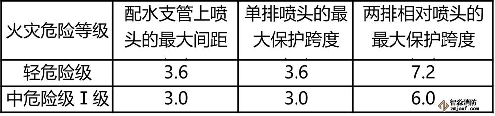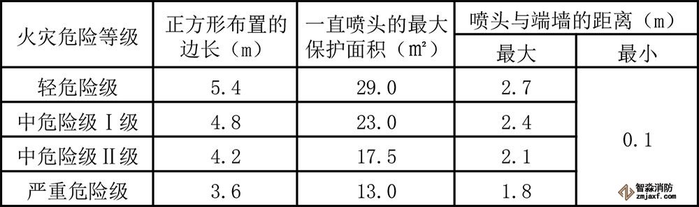 直立型、下垂型標準覆蓋面積灑水噴頭的布置,包括同一根配水支管上噴頭的間距及相鄰配水支管的間距,應(yīng)根據(jù)設(shè)置場所的火災(zāi)危險等級、灑水噴頭類型和工作壓力確定,并不應(yīng)大于下表的規(guī)定,且不應(yīng)小于1.8m。