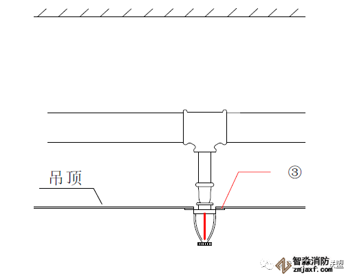 2、有吊頂?shù)南麓剐蛧婎^安裝噴頭根部應與吊頂平齊;為避免定位不準,可在吊頂龍骨標高確定后再安裝下噴支管;下噴頭與三通之間的短管長度不宜超過150mm
