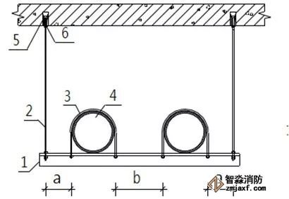 1.支架橫擔  2.鍍鋅螺桿  3.管碼  4.管道  5.頂爆螺栓  6.緊固螺栓