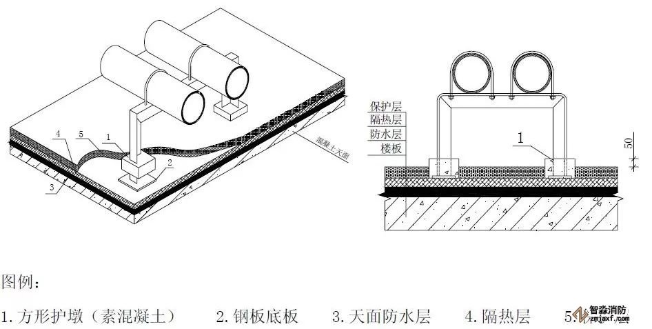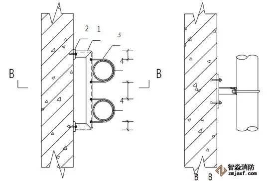 1.角鋼  2.連接板(10mm,做為承重支架,當使用80以上的角鋼時采用)  3.管碼  4.管道