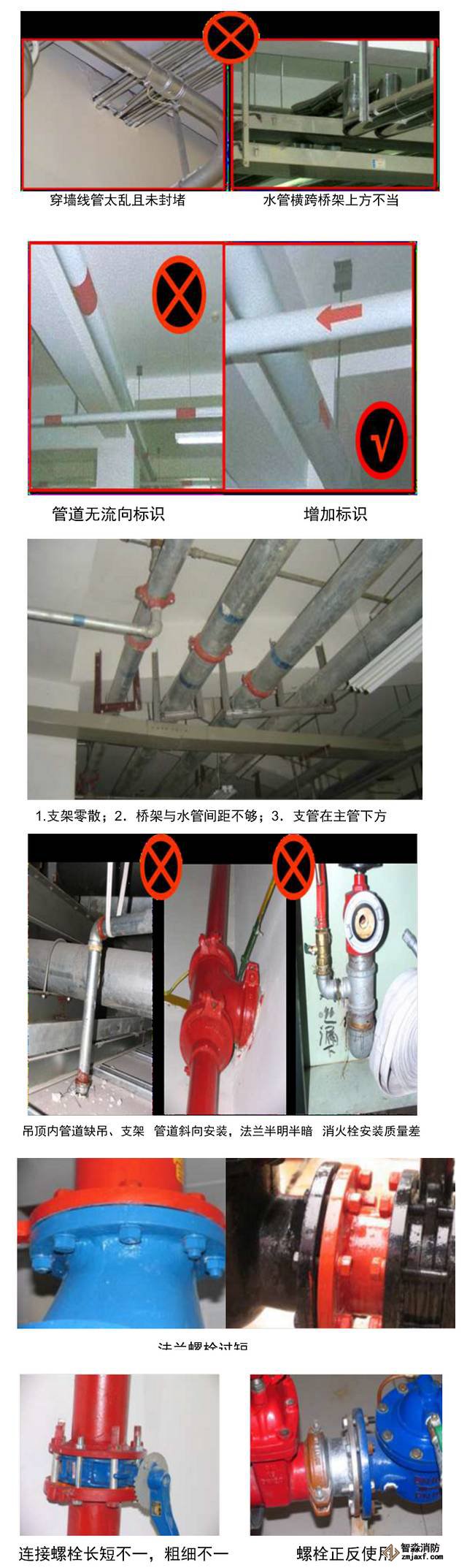 (6)采暖管道、消防管道(吊頂內(nèi))防腐和保溫存在的問題:油漆厚度不均勻,有的工程是在申報(bào)魯班獎(jiǎng)?wù)薰こ虝r(shí)補(bǔ)刷的,水平管子下部油漆流淌,結(jié)瘤等缺陷,管道保溫層表面不平整,圓弧不均勻,外表粗細(xì)不一等缺陷,影響觀感。有的應(yīng)做色環(huán)圈標(biāo)識(shí)的未做。如:自動(dòng)噴水滅火系統(tǒng)的配水干管、配水管規(guī)范要求做紅色或紅色環(huán)圈標(biāo)志。