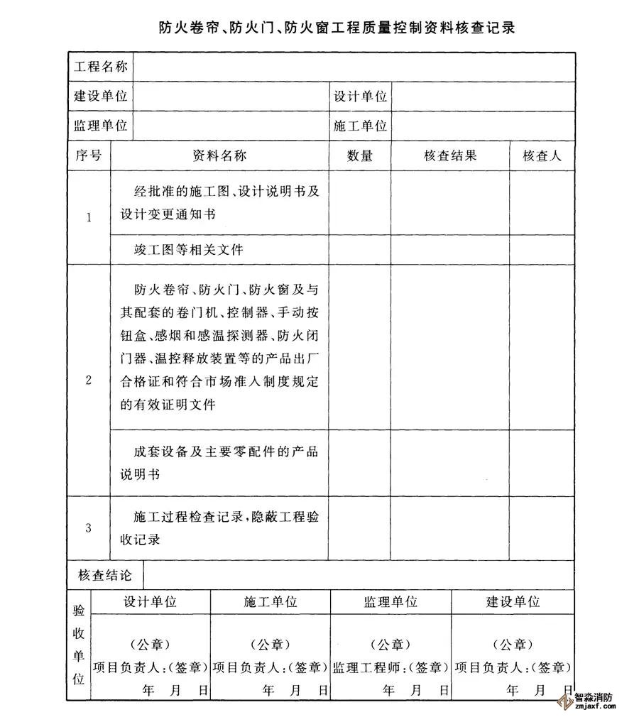 2、防火卷簾、防火門(mén)、防火窗工程質(zhì)量驗(yàn)收前,施工單位應(yīng)提供下列文件資料,并應(yīng)按下表填寫(xiě)資料核查記錄: