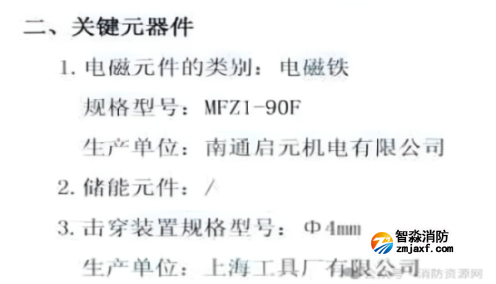 示例1:某柜式七氟丙烷滅火裝置型式《檢驗報告》列示有電磁驅(qū)動裝置的關(guān)鍵元器件,現(xiàn)場產(chǎn)品的電磁鐵等的規(guī)格型號和生產(chǎn)單位應(yīng)與型式《檢驗報告》一致。