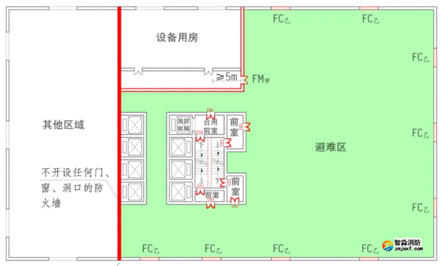 原則上,當(dāng)避難層的避難區(qū)和設(shè)備用房的面積較小時,可將避難層的局部區(qū)域作為其他功能,但應(yīng)采用不開設(shè)任何洞口的防火墻分隔,避難區(qū)應(yīng)至少有兩個面靠外墻,參見【圖示】。在實(shí)際應(yīng)用中,這種處理方式主要適應(yīng)于住宅建筑,說明如下: