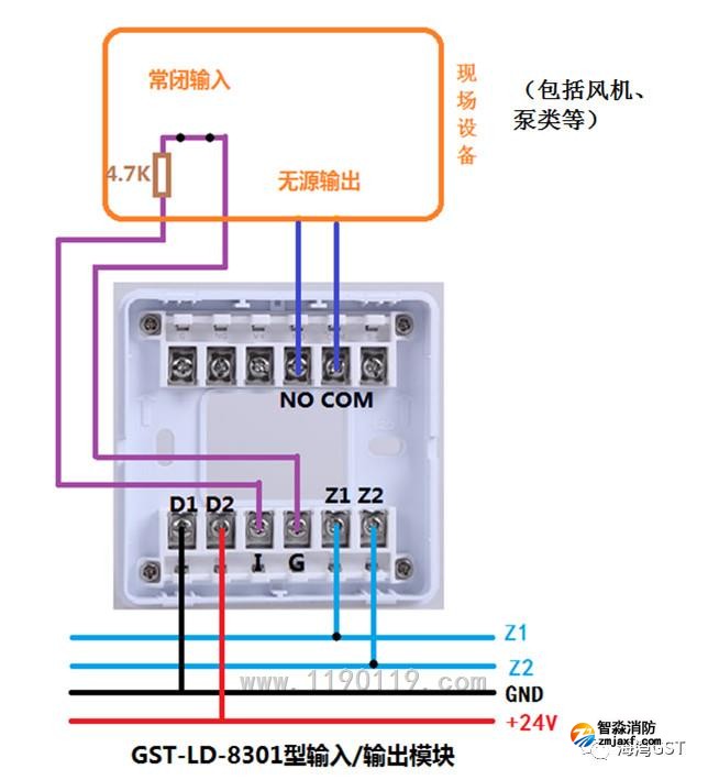 6、8301模塊采用有源輸出方式,輸入端為無源常閉觸點的接線方法: