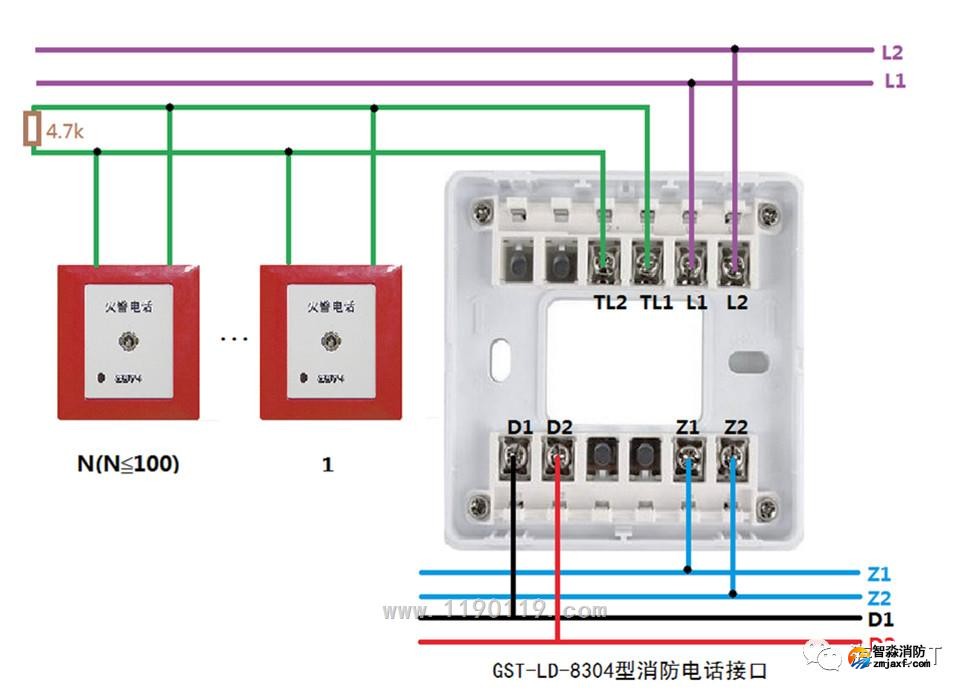9、8304型消防電話接口接線方法: