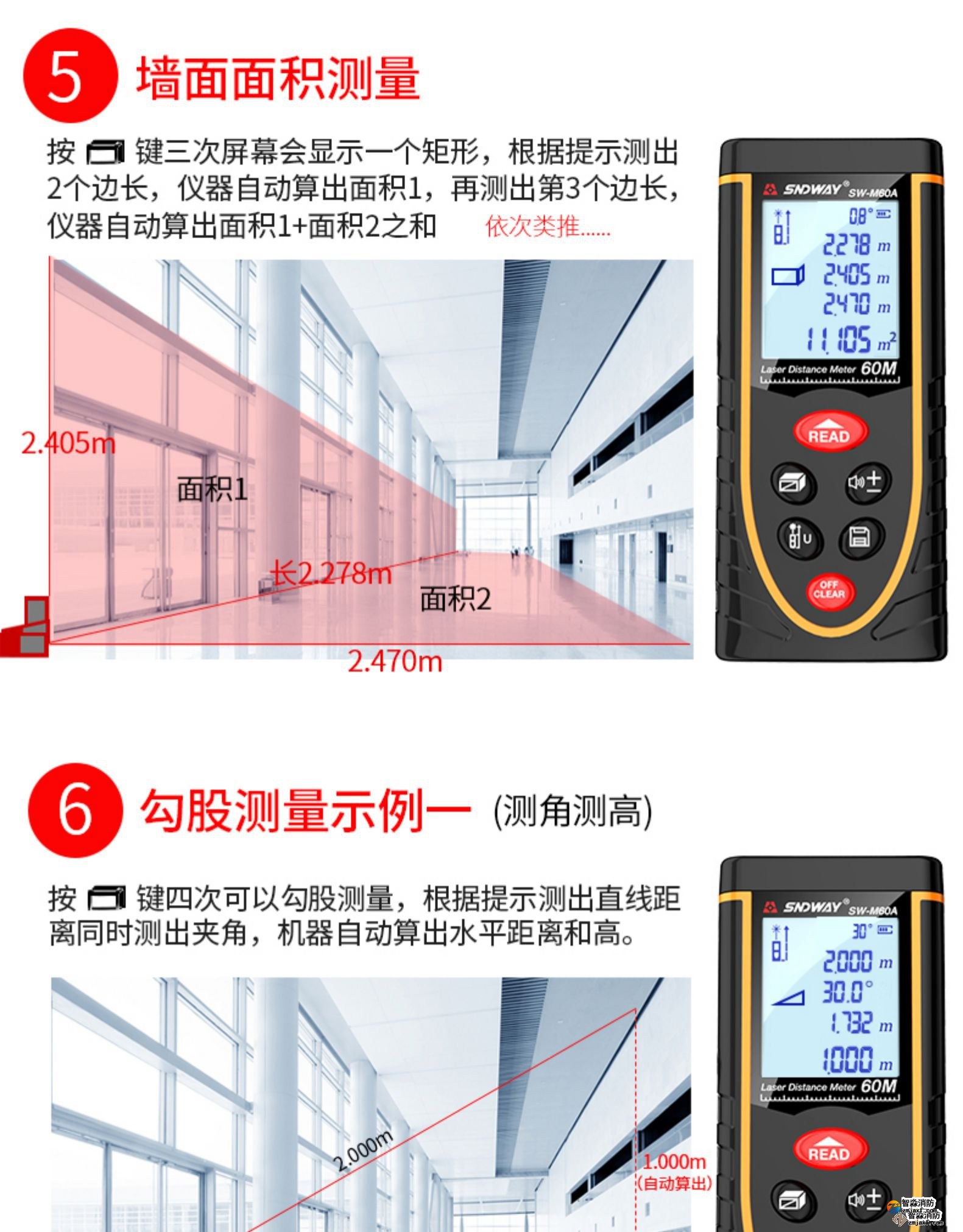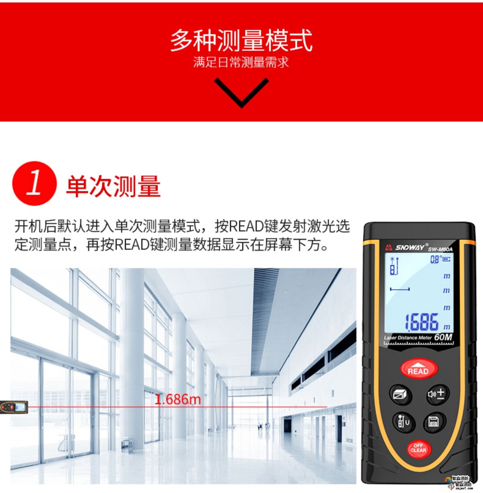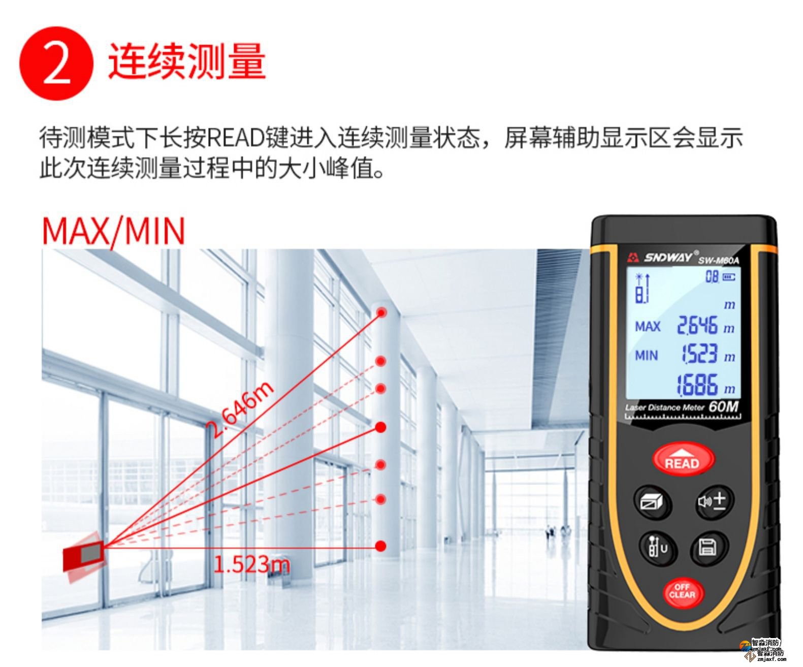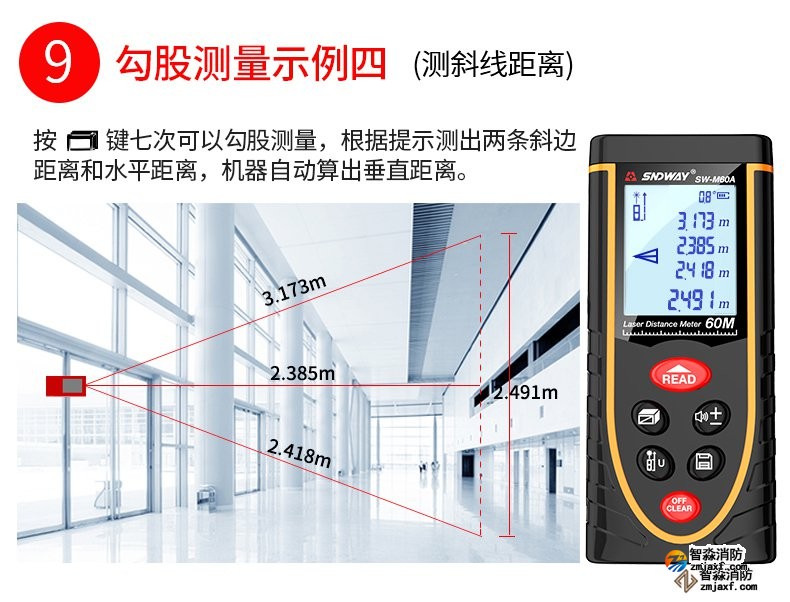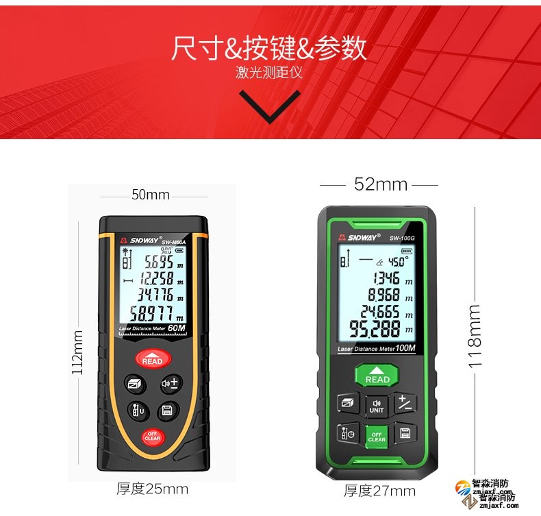 激光測距儀量程不小于50m;精度:3mm測量距離、面積、空間、體積
