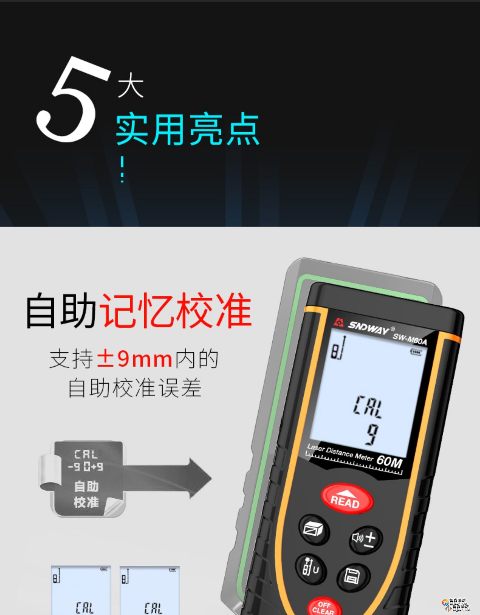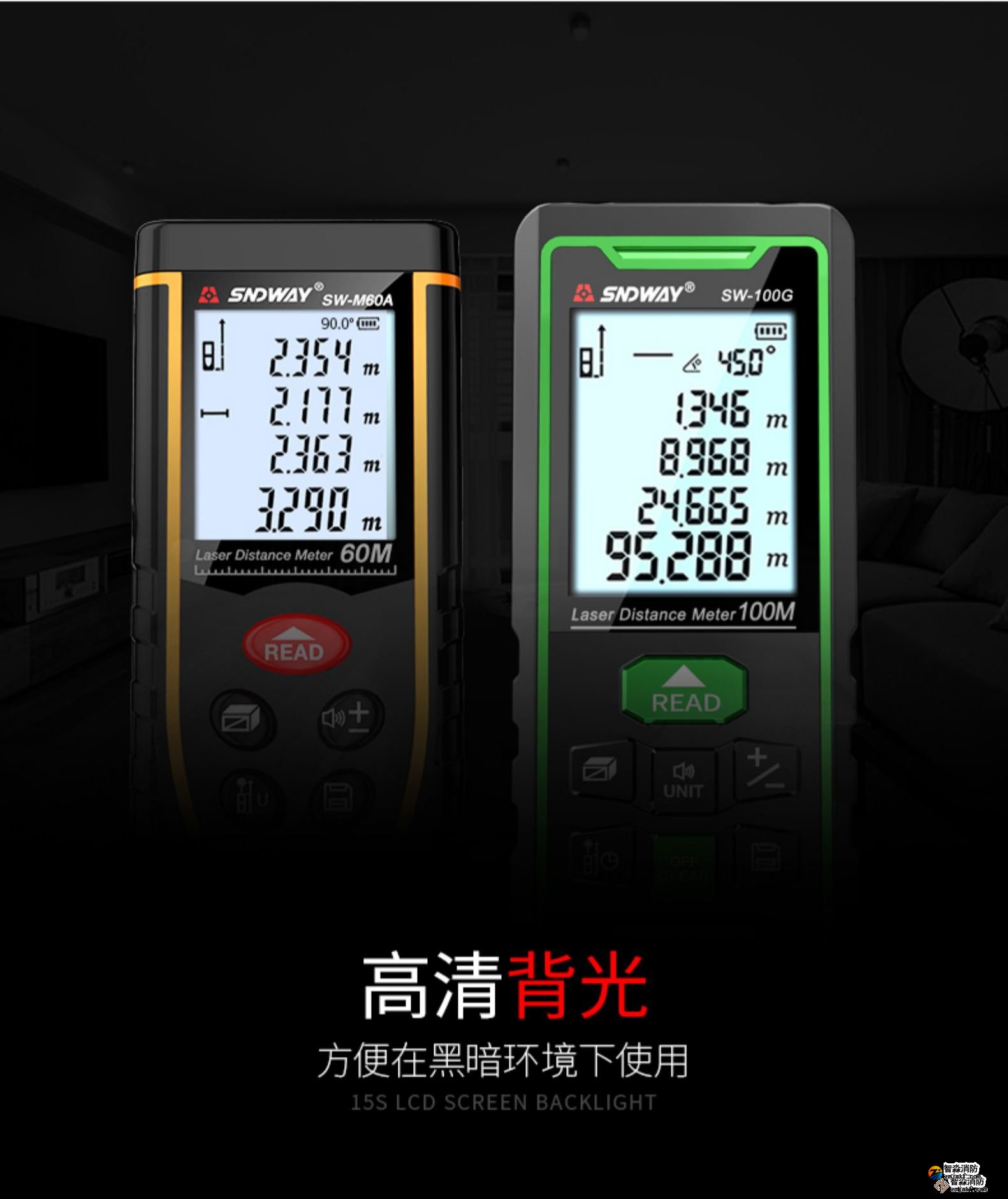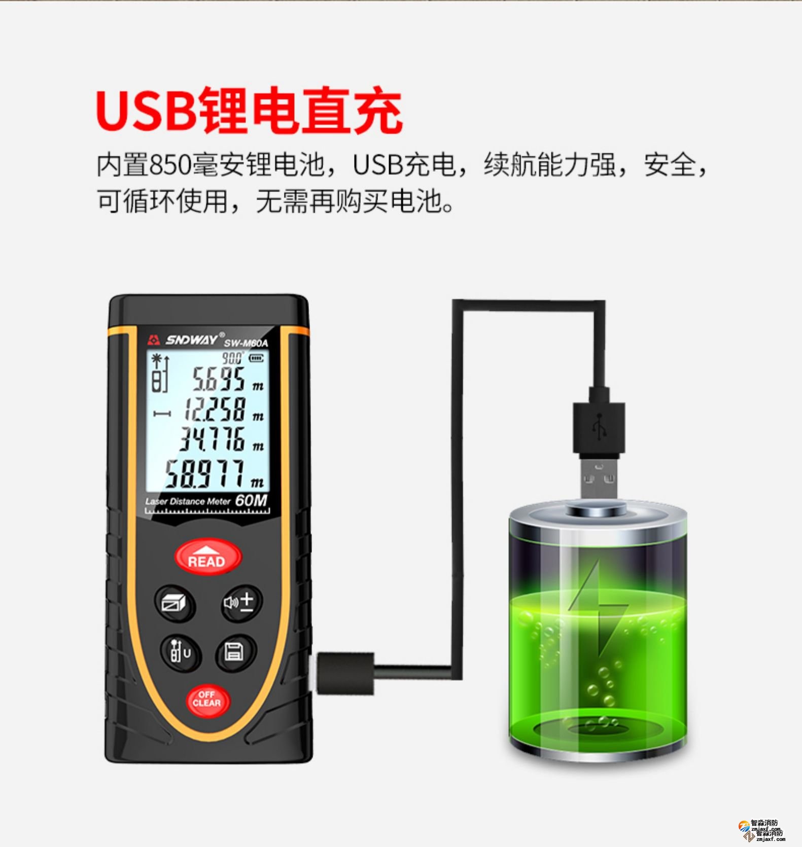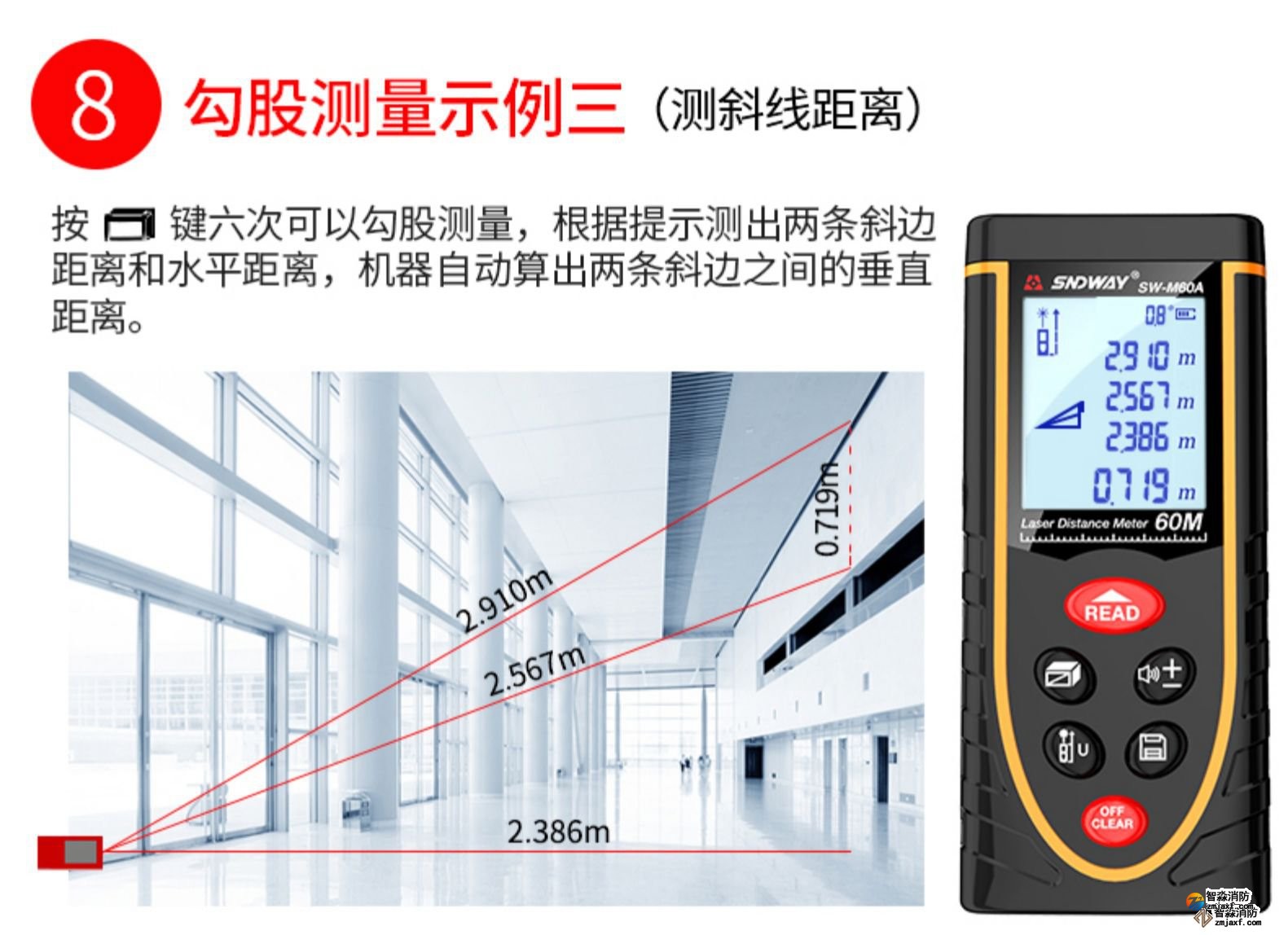 激光測距儀量程不小于50m;精度:3mm測量距離、面積、空間、體積