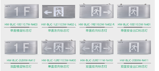 N400系列集中電源集中控制型消防應急標志燈具包括以下產品:HW-BLJC-1LRE110.5W-N400(單面雙向標志燈)、HW-BLJC-10E110.5W-N401(單面安全出口標志燈)、HW-BLJC-1RE110.5W-N402-R(單面右向標志燈)、HW-BLJC-1LE110.5W-N402-L(單面左向標志燈)、HW-BLJC-10E110.7W-N403(單面樓層標志燈)、HW-BLJC-2LRE111W-N410(雙面雙向標志燈)、HW-BLJC-20EIIlW-N411(雙面安全出口標志燈)、HW-BLJC-2LEIIlW-N412(雙面單向標志燈)。
