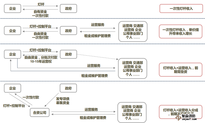 智慧燈桿前期建設(shè)投入的付費者是政府為主體,隨著商業(yè)模式越來越清晰,資金來源從單純的財政支出轉(zhuǎn)為專項債為主,企業(yè)參與也從墊資換取運營權(quán)的模式轉(zhuǎn)換為與政府合作運營的模式,緩解資金壓力,整合資源。