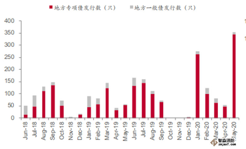 2020年1-5月累計發(fā)行地方專項債818只,同比增發(fā)506只;累計地方專項債發(fā)行額為21697.92億元,同比增長148.45%;地方專項債占地方債比例也從2019年1-5月的55.25%上升至79.41%。