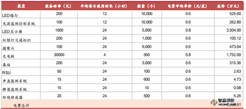 然后是項目支出的測算:主要包括電費支出、固定資產(chǎn)折舊、資金成本的人員工資。其中,電費支出主要包括LED路燈、光源控制系統(tǒng)、LED顯示屏、信號燈、攝像頭、充電樁、基站、WiFi熱點、RSU、井蓋和橋梁監(jiān)測系統(tǒng)、環(huán)境傳感器等裝置使用電費。計算平均使用時間和單價,合計10000根智慧燈桿每年使用電費6950萬元。