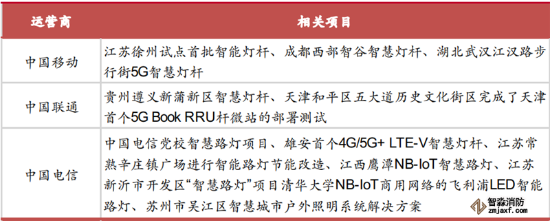 國內(nèi)三大運營商獨立或與華為等廠商合作,布局智慧燈桿建設(shè),5G智慧燈桿、NB-IoT智慧路燈項目已落地。