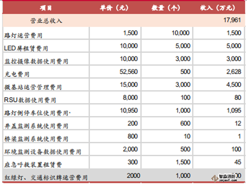 其次是項目營收的測算,主要有來自政府及相關(guān)部門支付的路燈、監(jiān)控、信號燈、WIFI熱點、井蓋監(jiān)測、橋梁監(jiān)測、環(huán)境監(jiān)測、應(yīng)急呼救等租賃使用費和運營商支付的基站租賃費用、車聯(lián)網(wǎng)支付RSU數(shù)據(jù)使用費用、消費者支付充電費用。
