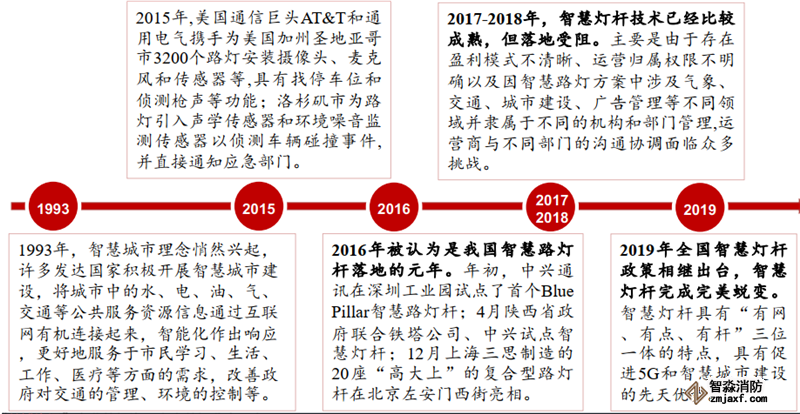 1993年智慧城市理念興起,但直到2015年才從美國開始有了正真意義上的智慧燈桿,2016年是我國智慧燈桿正式落地元年,2017-2018年智慧燈桿技術(shù)發(fā)展成熟卻由于運營、盈利模式等問題落地受阻,2019年作為5G商用元年為智慧路燈發(fā)展創(chuàng)造了新機(jī)遇。