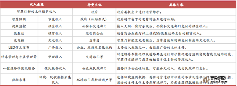 智慧燈桿主要有主體維護(hù)收入和基于相應(yīng)功能的視頻監(jiān)控租金收入、小微基站租賃收入、充電收入、廣告收入、停車井蓋管理收入、便民服務(wù)收入、數(shù)據(jù)采集收入。