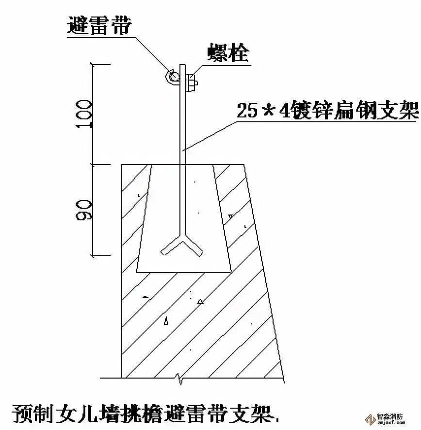 ⑴現(xiàn)澆女兒墻挑檐避雷帶支架安裝做法如下圖,扁鋼支架在安裝時(shí)要密切和土建專業(yè)配合好,對(duì)成排的避雷帶支架的水平度、垂直度要拉線逐個(gè)檢查。