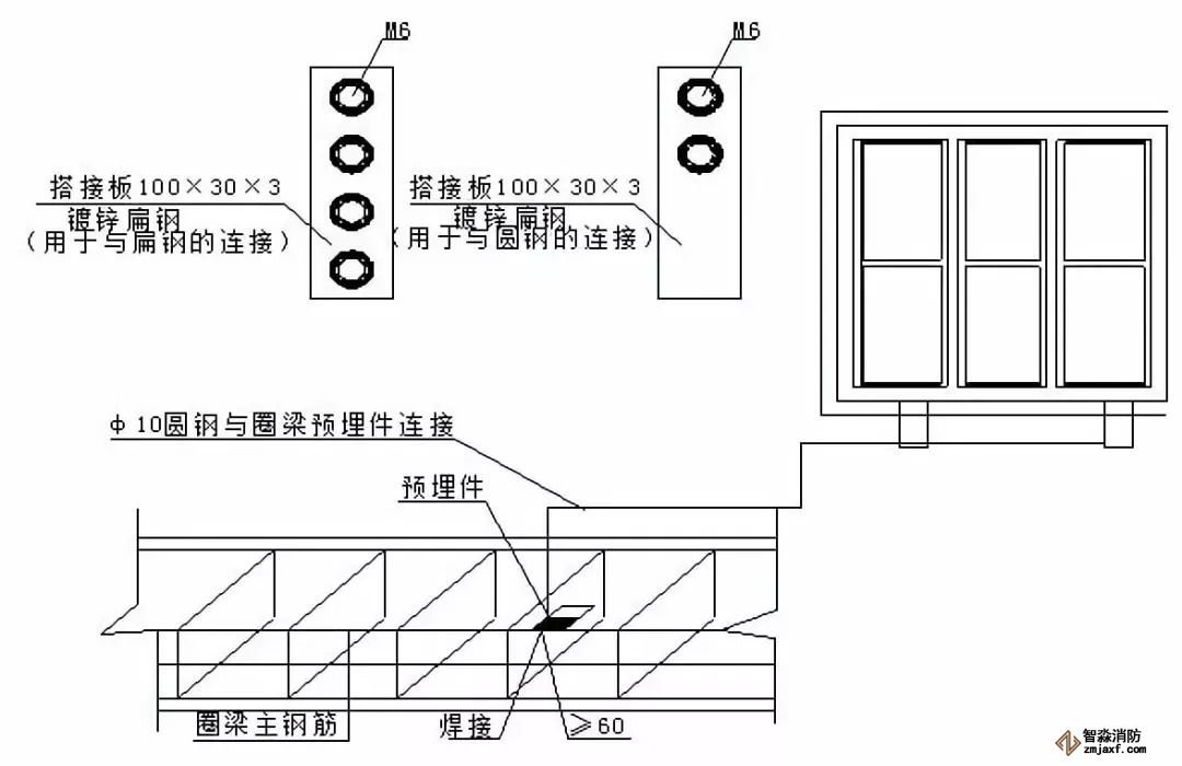 ⑸金屬窗框的等電位也可從窗框的頂部或側(cè)面與圈梁或柱主筋預(yù)埋件連接,連接件可以是25×4的鍍鋅扁鋼或φ10的圓鋼。