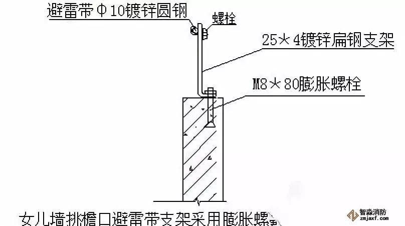 ⑶ 女兒墻挑檐避雷帶支架用膨脹螺栓固定安裝做法如下圖:
