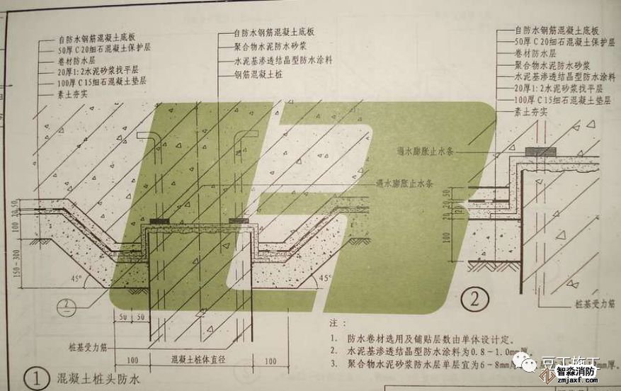 在樁頭、樁側(cè)及樁側(cè)外圍200mm范圍內(nèi)墊層的表面涂刷水泥基滲透結(jié)晶型防水涂料,在樁頭根部及樁頭鋼筋根部凹槽內(nèi)埋設(shè)遇水膨脹橡膠條,在樁頂、樁側(cè)及樁側(cè)外圍300mm范圍內(nèi)墊層上表面5mm厚聚合水泥防水砂漿。待基層達(dá)到卷材施工條件時(shí)進(jìn)行大面積防水卷材施工,卷材施工完畢后在樁側(cè)與卷材接縫處嵌聚硫嵌縫膏。