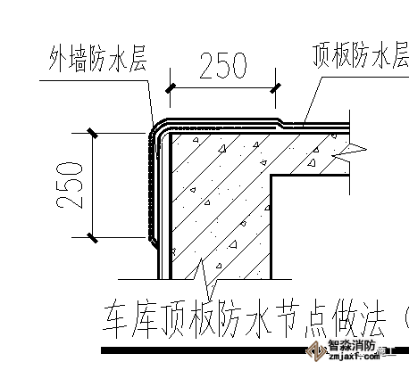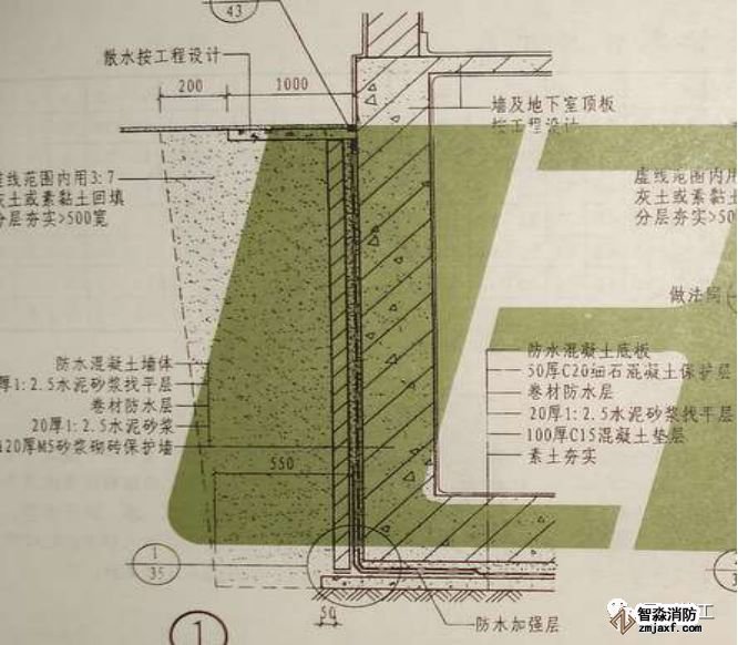 室外地下室頂板防水做法:a、現(xiàn)澆砼板b、20厚1:3水泥砂漿找平壓光;c、兩道4mm厚-20度SBS防水卷材(滿(mǎn)鋪);d、無(wú)紡布隔離層一道;e、80厚C20砼保護(hù)層找平壓實(shí)。