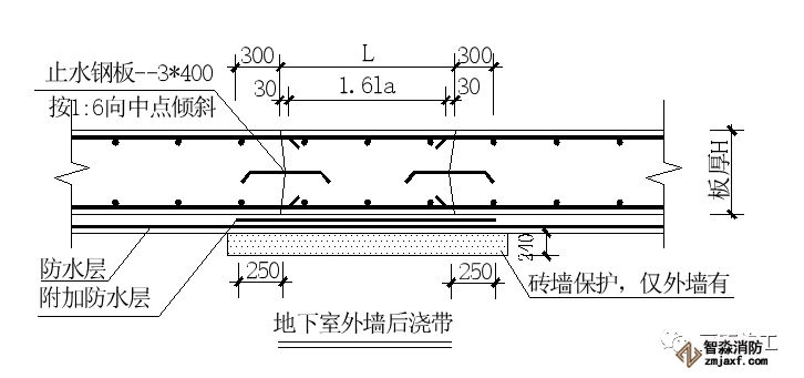工藝說(shuō)明:地下室外墻后澆帶在做防水施工前,內(nèi)側(cè)的卷材保護(hù)層先施工。鋪貼外墻卷材時(shí),先在剪力墻外側(cè)鋪一層防水加強(qiáng)層,然后大面卷材直接鋪過(guò)與之蓋板。綁扎墻體鋼筋時(shí),用附加筋將止水鋼板固定墻體中間。