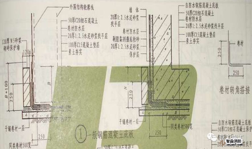 ④側(cè)墻卷采防水層的保護(hù)層與防水層應(yīng)粘接牢固,結(jié)合緊密,厚度均勻一致。在立面與平面的轉(zhuǎn)角處,卷材的接縫應(yīng)留在平面上,距立面不應(yīng)小于600mm;陰陽(yáng)角處找平層應(yīng)做成圓弧或45°(135 °)角,并應(yīng)增加1層相同的卷材,寬度不宜小于500mm。點(diǎn)擊>>工程資料免費(fèi)下載