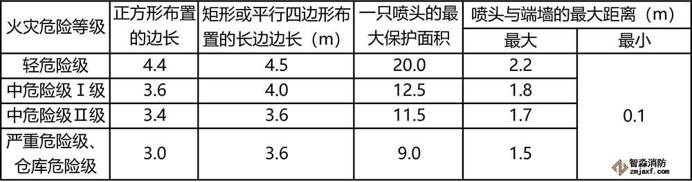 直立型、下垂型標準覆蓋面積灑水噴頭的布置,包括同一根配水支管上噴頭的間距及相鄰配水支管的間距,應(yīng)根據(jù)設(shè)置場所的火災(zāi)危險等級、灑水噴頭類型和工作壓力確定,并不應(yīng)大于下表的規(guī)定,且不應(yīng)小于1.8m。