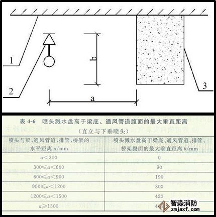· 當噴頭濺水盤高于附近梁底或?qū)挾刃∮?.2m的風(fēng)管、排管、橋架腹面時,噴頭濺水盤高于梁底、風(fēng)管、排管、橋架腹面的最大垂直距離應(yīng)符合下表的規(guī)定:
