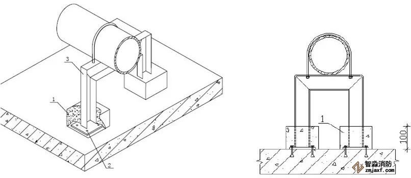 1.角鋼  2.連接板(10mm,做為承重支架,當使用80以上的角鋼時采用)  3.管碼  4.管道