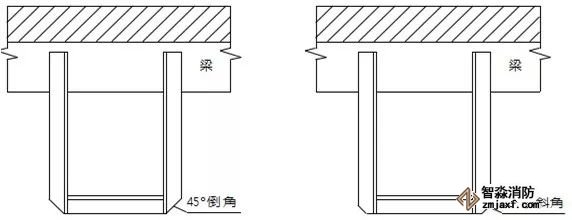 當梁、通風管道、排管、橋架寬度大于1.2 m時,增設的噴頭應安裝在其腹面以下部位;風管下噴頭吊架應采取管道延長至風管另外一端邊緣,并在延伸管道末端設置吊架