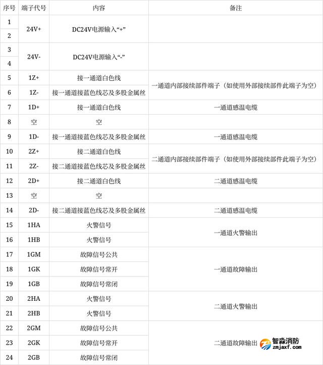 按圖3要求,將24V電源線、信號線從防水接頭穿入盒體,接入相應(yīng)的接線端子,感溫線纜兩端穿入微電腦處理器和終端盒上的防水接頭,擰緊防水接頭。一通道感溫電纜白色線芯接1D+端子,藍色線芯及金屬絲接1D-端子,(如使用信號處理單元內(nèi)部的接繼部件,感溫電纜的另一端白色線芯接在1Z+端子、藍色線芯接1Z-端子)。二通道感溫電纜白色線芯接2D+端子,藍色線芯及金屬絲接2D-端子,(如使用信號處理單元內(nèi)部的接繼部件感溫電纜的另一端白色線芯接在2Z+端子、藍色線芯接2Z-端子)。