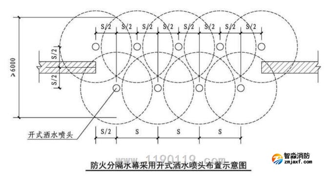 防火分隔水幕的噴頭布置,應(yīng)保證水幕的寬度不小于6m。采用水幕噴頭時(shí),噴頭不應(yīng)少于3排;采用開式灑水噴頭時(shí),噴頭不應(yīng)少于2排。防護(hù)冷卻水幕的噴頭宜布置成單排。