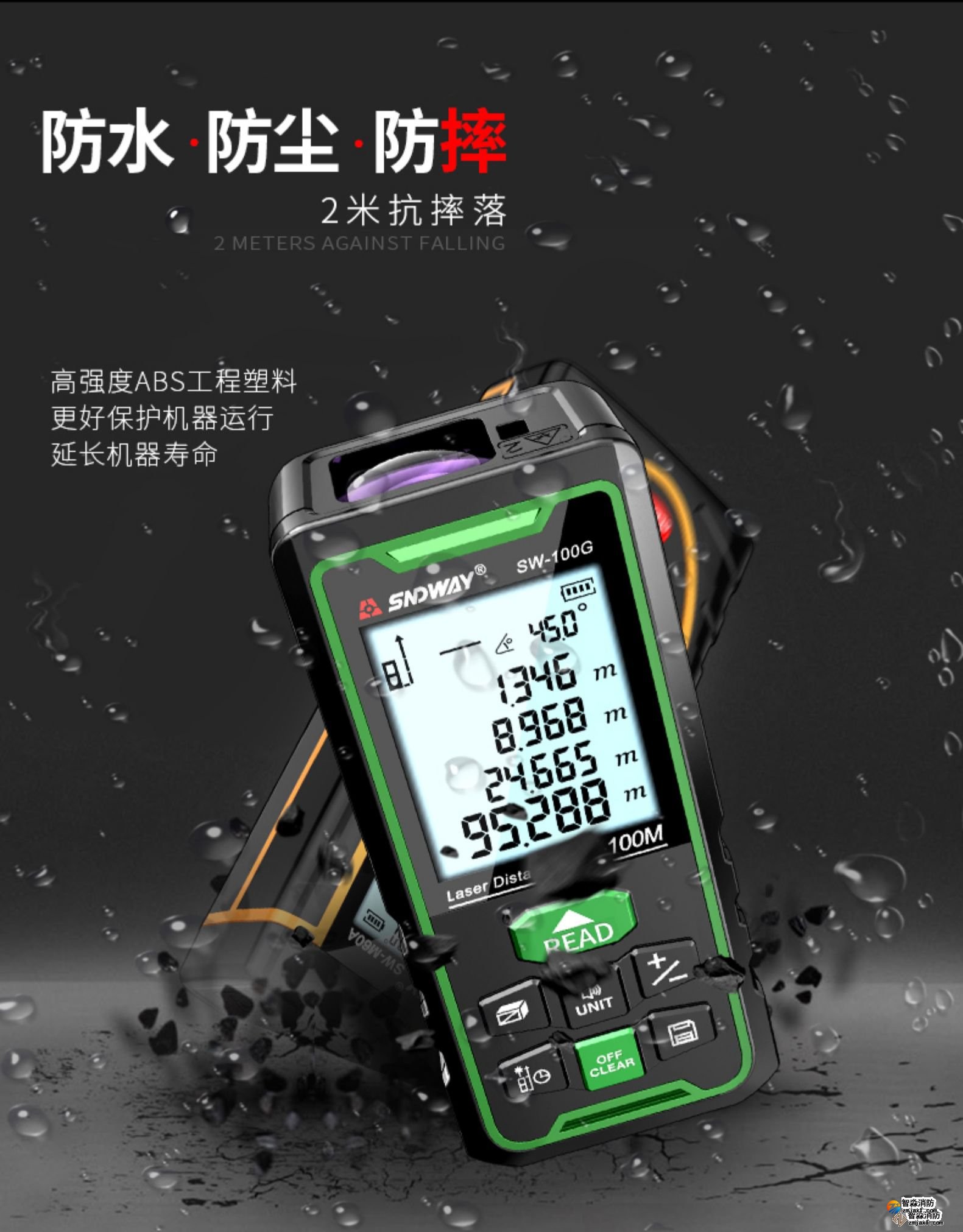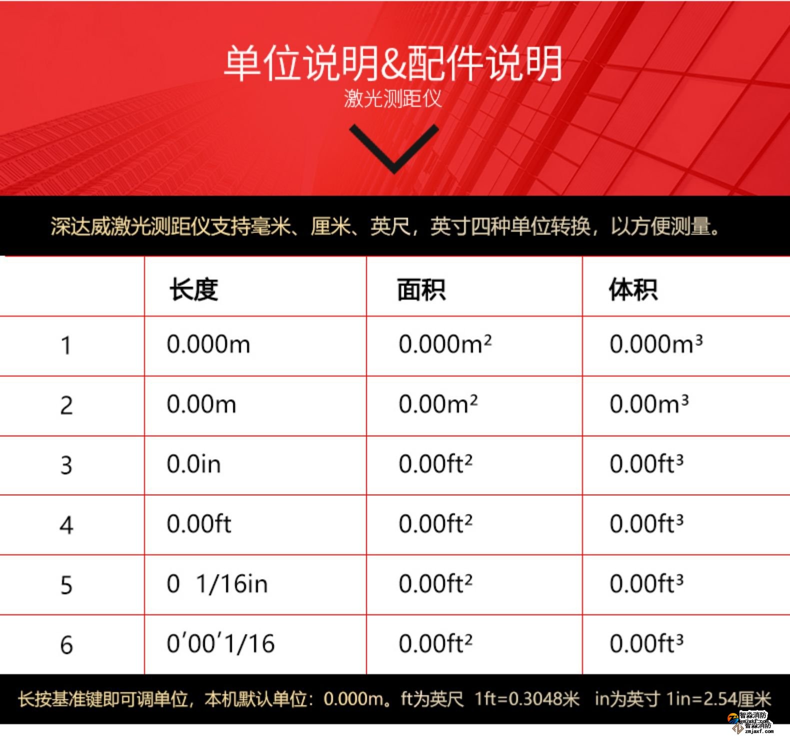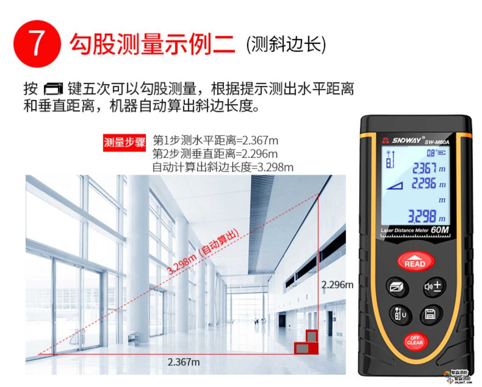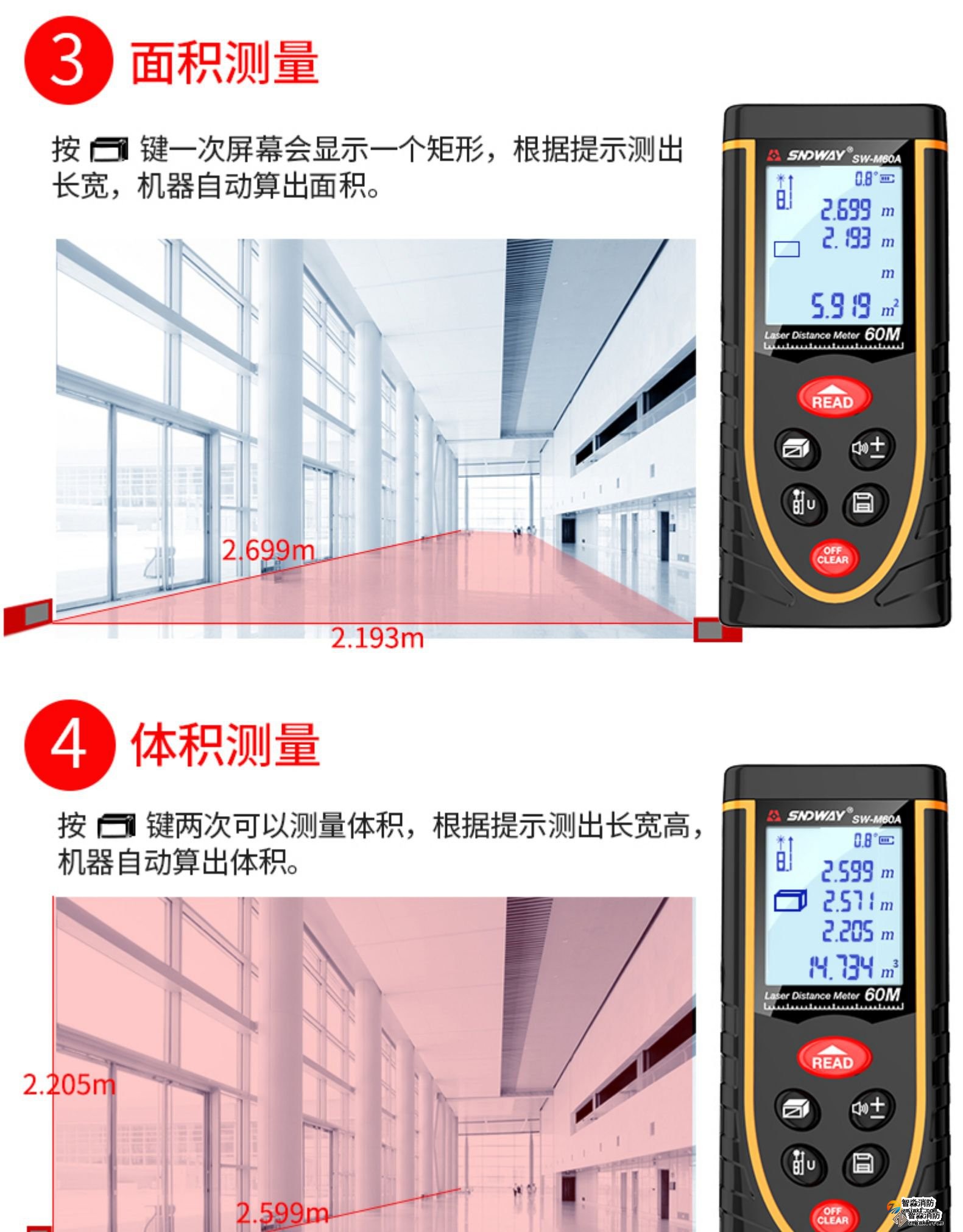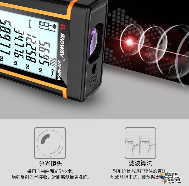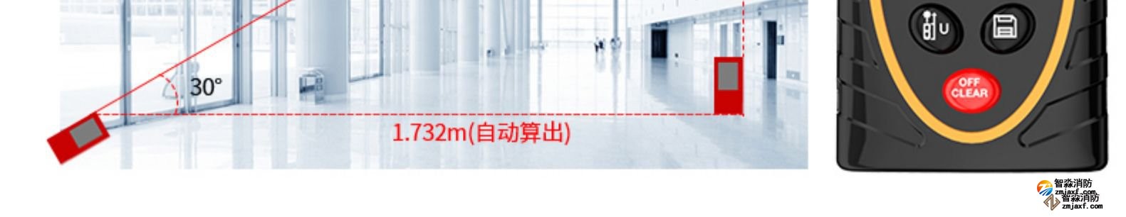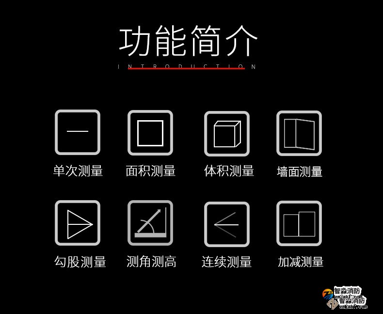 激光測距儀量程不小于50m;精度:3mm測量距離、面積、空間、體積