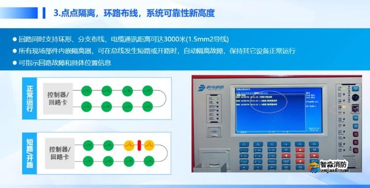 ③ 點點隔離,環(huán)路布線,系統(tǒng)可靠性新高度。我們新產(chǎn)品實現(xiàn)了真正意義上的環(huán)形回路,并且所有的現(xiàn)場部件都自帶隔離器,可以具備點點隔離的功能。它帶來的好處是,根據(jù)現(xiàn)場產(chǎn)品的應(yīng)用,可以自動生成系統(tǒng)的網(wǎng)絡(luò)拓撲結(jié)構(gòu);如果現(xiàn)場總線發(fā)生短路、開路故障的時候,自帶隔離器的現(xiàn)場部件,比如煙感、溫感,可以自動隔離開短路,保持整個回路其他設(shè)備的正常運行,同時也能在我們的消防報警主機上顯示故障點的位置,給這種復(fù)雜情況下的快速處置、快速應(yīng)對、系統(tǒng)的修復(fù)贏得寶貴的時間。