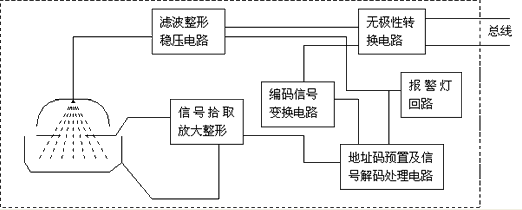 信號(hào)放大拾取整形電路將電離室里的微弱電流信號(hào)轉(zhuǎn)變成較大的電壓信號(hào),通過(guò)高輸入阻抗的場(chǎng)效應(yīng)管進(jìn)行耦合放大,地址碼預(yù)置及信號(hào)解碼處理電路如是開(kāi)關(guān)量探測(cè)器直接將其電壓變化與閾值電壓進(jìn)行比較, 判別是否報(bào)警,如是模擬量探測(cè)器, 則將電壓變化傳到報(bào)警控制器,如探測(cè)器內(nèi)置有CPU芯片,則其自身可以進(jìn)行智能處理,利用內(nèi)置的智能算法進(jìn)行判斷, 同時(shí)探測(cè)器至報(bào)警器間發(fā)生電路斷線, 探測(cè)器安裝接觸不良或探測(cè)器內(nèi)部電路元件損壞等都能夠發(fā)出故障報(bào)警信號(hào)。濾波整形穩(wěn)壓電路是給離子源、集成電路和CPU等芯片提供直流工作電壓,總線上發(fā)送的各種編碼信息需經(jīng)編碼信號(hào)變換電路處理后發(fā)送給解碼電路,并將解碼電路發(fā)送的狀態(tài)信息和值(煙霧濃度)傳至總線上供報(bào)警器接收處理。